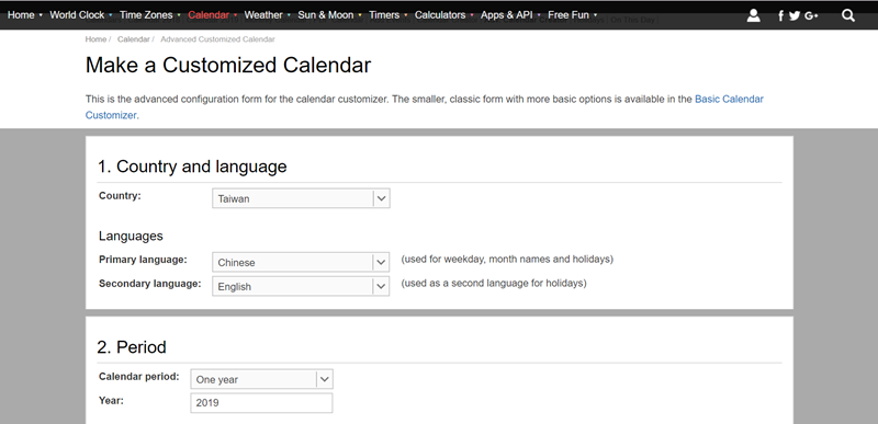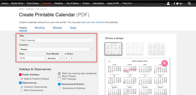 這個網站其實是綜合性的,其他還有時區轉換、計時器、世界時鐘、各種時間計算器等等,相當豐富,今天著重在日曆類別,先來看適合列印的 PDF 格式,輸入標題(不支援中文),選擇國家、年分、起始月等資料,選擇版型,點下載。