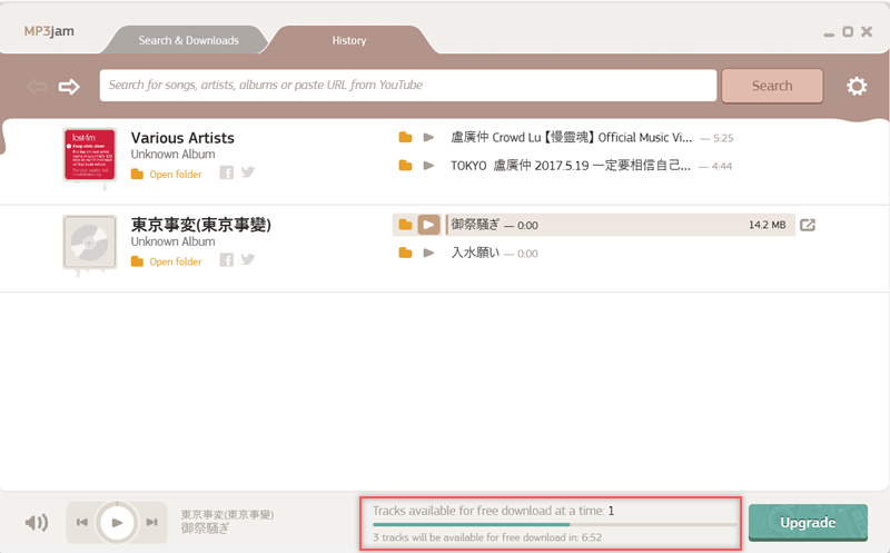 輸入歌手的話會依最新或最受歡迎來排序,如果是整張專輯也可以一次下載,不過要升級專業版才行,阿湯試過一個一個點的話會有時間限制,大致上 5 分鐘內只能連續下載兩首。