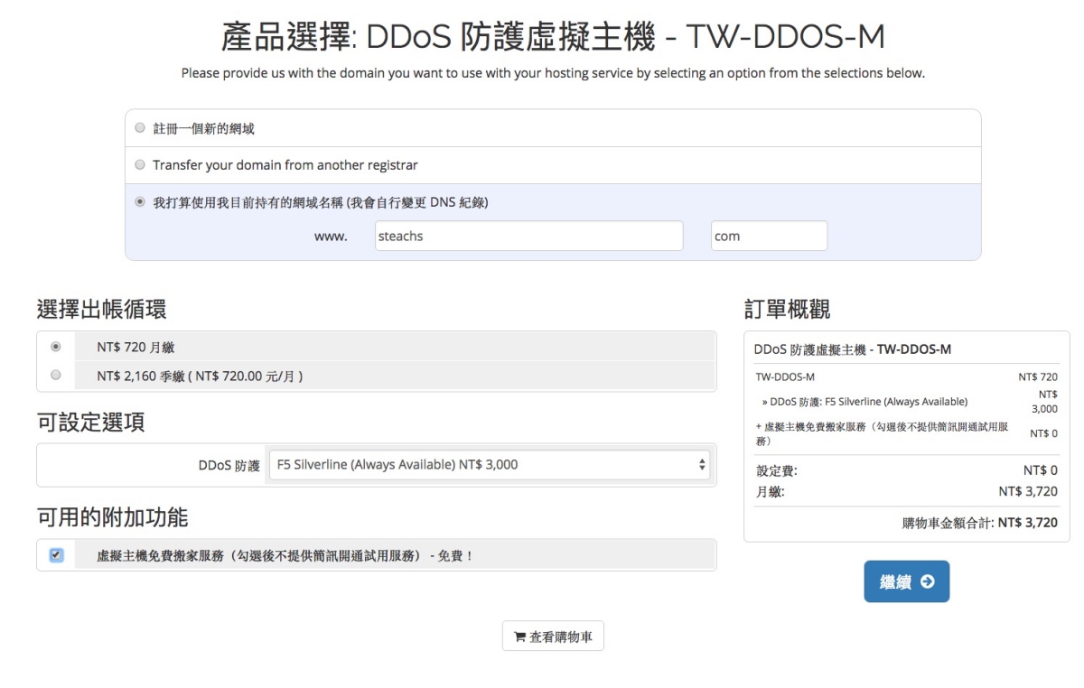 不論申請什麼主機方案,只要透過線上申請馬上就能完成開通使用,這邊以阿湯申請的 DDoS 防護虛擬主機為例,選擇方案後只要輸入要使用的域名後填寫相關資料並完成付款就可以了,如果需要搬家服務轉移到新申請的主機也可以在這裡一併提出,就會有專人和你連繫囉。