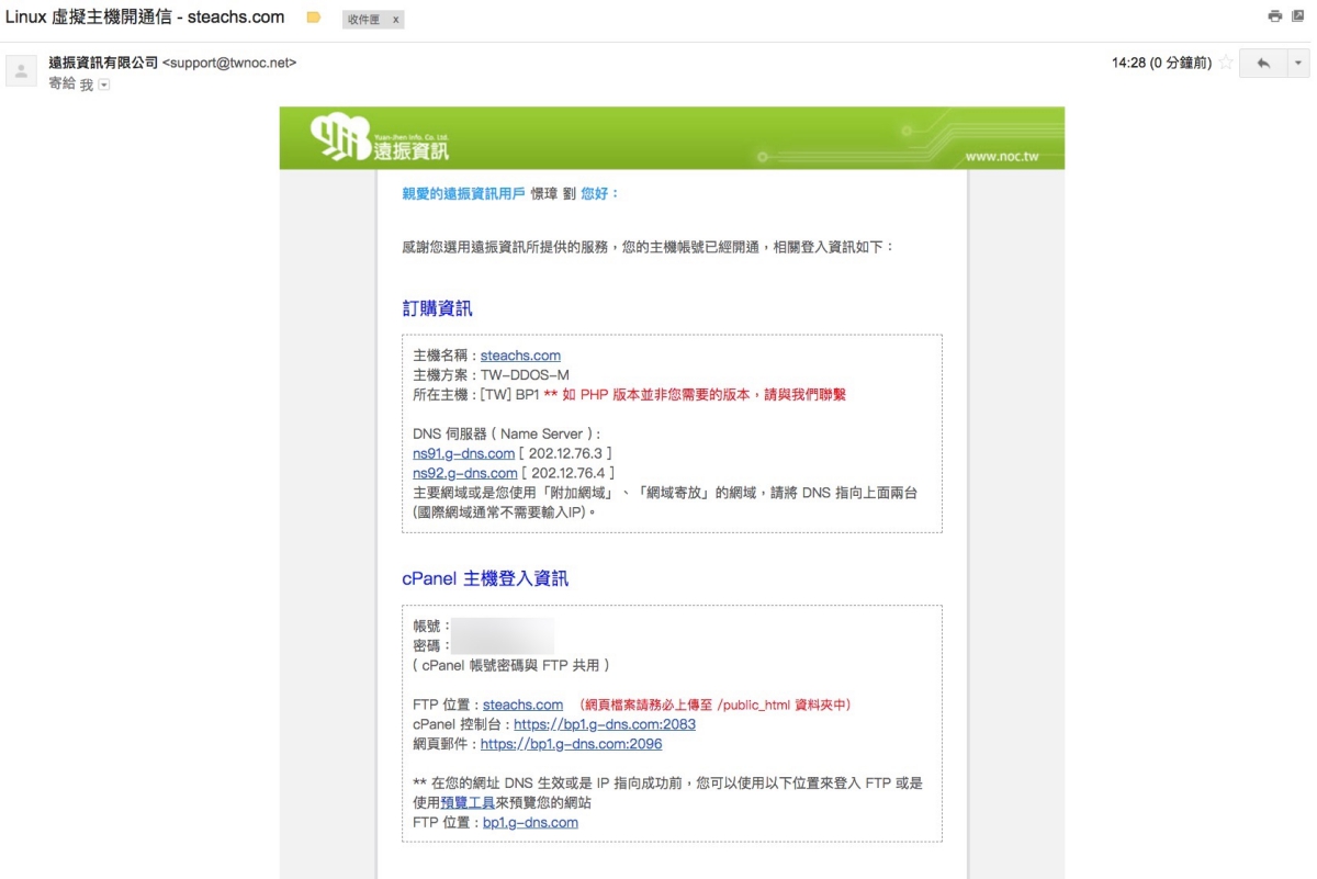 從申請到開通阿湯只花了不到五分鐘的時間,就收到了主機相關連線資訊了,非常的便利。