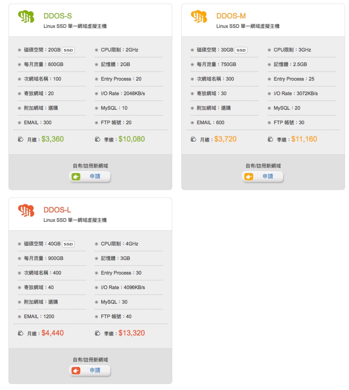 再來阿湯以 DDoS 防禦虛擬主機為例,在這裡面還有以不同規格、容量、流量來區域方案,分別是 DDOS-S、DDOS-M 及 DDOS-L 三種,以企業的「官網」來說,一般都是選最小的 DDOS-S 方案就足夠,因為隨時不夠的話都能透過客服加價升級方案,所以阿湯都會推薦可以從最低方案開始使用起。