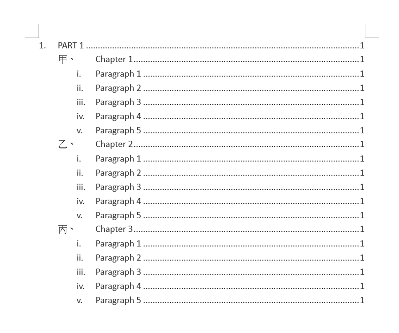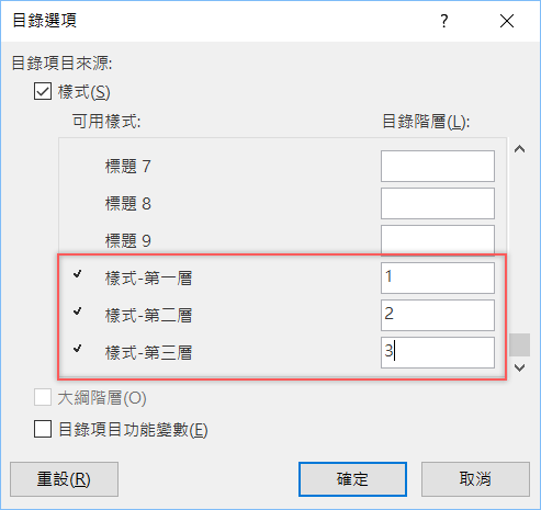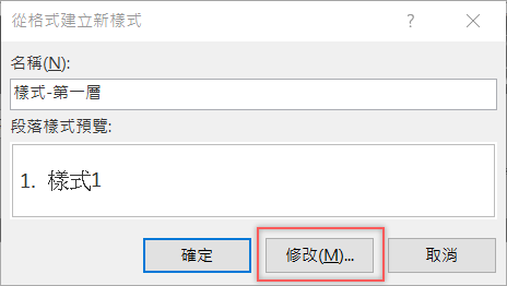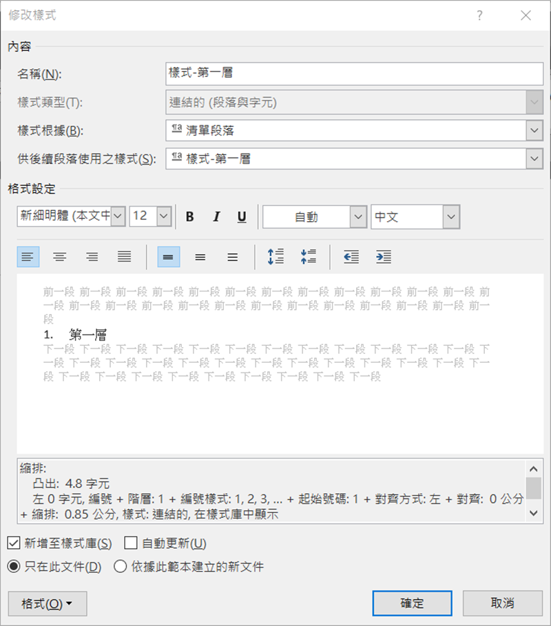 完成後就會出現樣式內容,原本阿湯設的「樣式-第一層」內容應該是「1.第一層(內容文字)」但這邊少了數字「1.」,很在意的話可以再加入一項功能變數。
