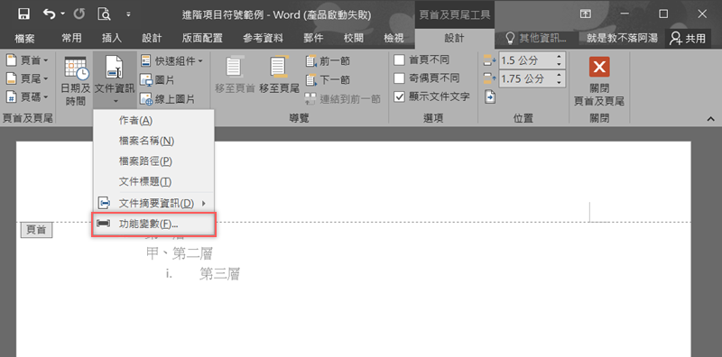 在文件前端空白處點兩下,進入頁首,我們要來插入一項「功能變數」,這是為了讓頁首可以跟第一層的內容同步,好像很抽象?來看阿湯怎麼做。