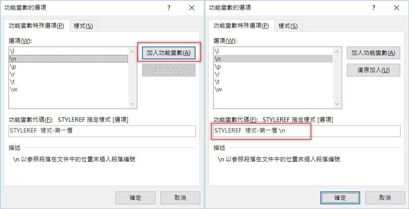 加入功能變數的特殊選項「\n」,表示以參照段落在文件中的位置來插入段落編號。