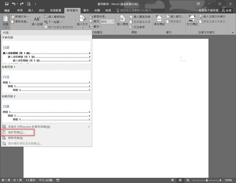也可以直接做成目錄,切換到參考資料左邊第一項,目錄 → 自訂目錄。