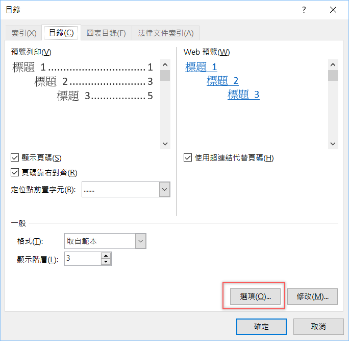 可預覽之後的顯示方式,包括頁碼及定位點前置字元等等,不過我們要先進入選項。