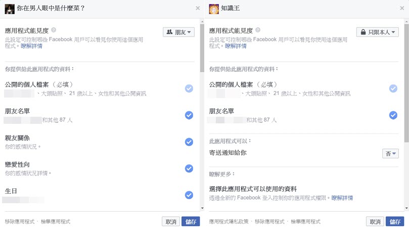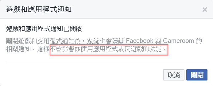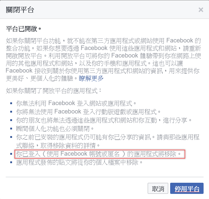 首先是關閉平台,這會讓你無法用臉書帳號去登入網站、遊戲或應用程式,朋友也無法透過這些程式跟你互動,重要的是,那些已經登入的應用程式將被刪除,如果你覺得用臉書比較方便,還是不要關閉吧。