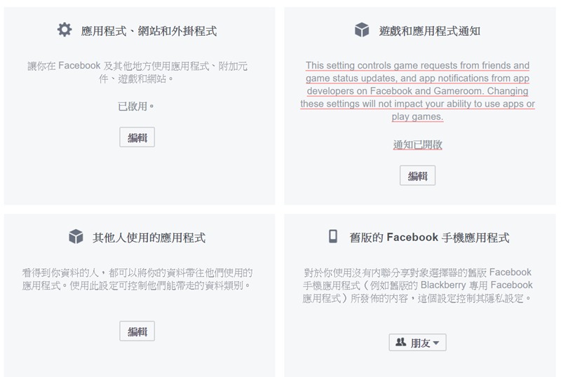 「其他人使用的應用程式」這區也蠻恐怖的,代表看得到這些有打勾的資訊的人,都可以將這些資訊帶到他們所使用的程式,臉書是希望促進社交性,但阿湯真的不太喜歡,所以通通取消勾選,也可以整個關閉平台,但如果你常需要下載一些有的沒的,比較適合用事後設定來取代關閉,當然,如果你認為資料外洩也無所謂、一直以來也沒受到影響,就略過吧。