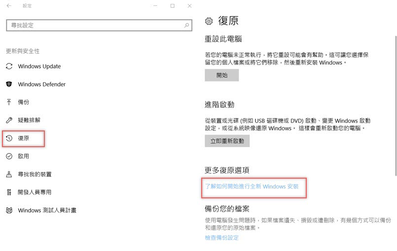 接下來帶大家看的幾個項目都在設定區,先來看更新與安全性中的「復原」,如果你的電腦已經使用一段時間,安裝了很多軟體之後常會造成額外的安全漏洞,或者運作時發生什麼問題也能使用復原的方式,備份後重新安裝 Windows,可從更多復原選項底下查看細節。