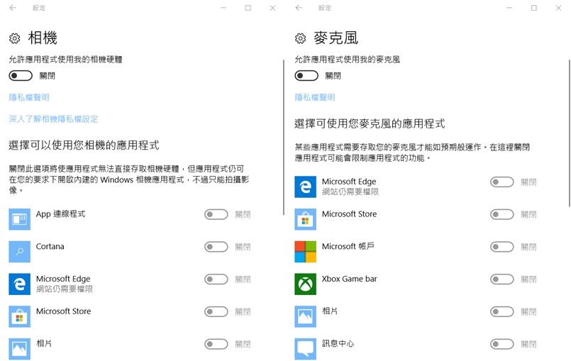 「相機和麥克風」的設定應該比較常見,因為通常都會詢問你才會開啟,但你也可以在這邊檢查,例如哪些程式其實是不需要用到鏡頭的,卻跟你要求權限?關閉比較好。