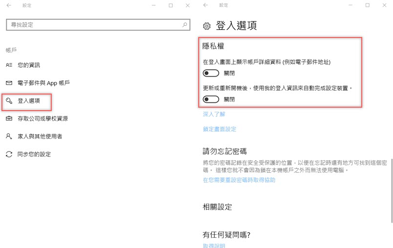 然後看「登入選項」,如果你的電腦是共用的或是公司用,建議將底下這兩項關掉,因為是關係你登入時的安全性,個人使用的話開著會方便些。