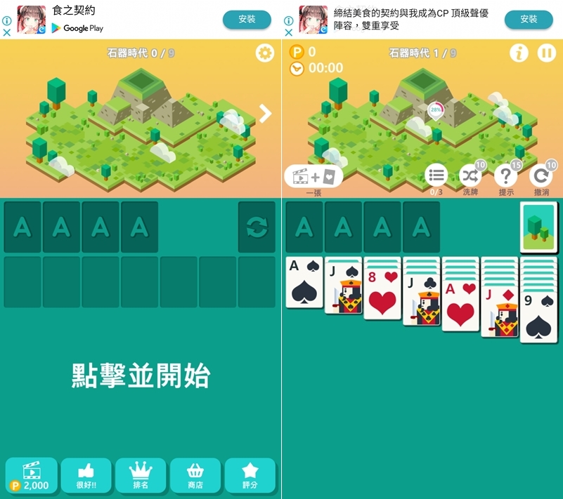 先從石器時代開始,底下就是我們熟悉的撲克牌接龍遊戲,雖然這樣說但因為太久沒玩,阿湯也是花一點時間才上手的,如果卡住了有提供洗牌、提示、撤銷按鈕,都是有限額的,要小心使用不然就要不斷看廣告來獲取。