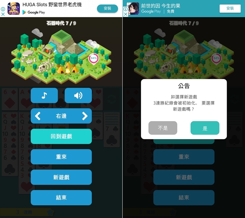 設定區除了可改變紙牌擺放位置之外,也能重來(同場重發牌)或重新開始,但如果選新遊戲連勝紀錄就會消失,有時候真的過不了也是要捨棄的,後來花了快兩小時才離開石器時代到中世紀,因為一直看廣告拿機會...你們一定不會像阿湯那麼笨的,試試看。