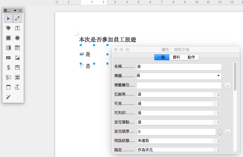 倒三角形點開裡面就是所有項目的名稱,包括標籤以及各種形狀的選取框格及按鈕,還可以畫出日期、金額相關的功能區塊。