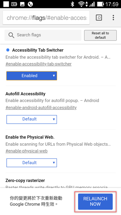 在網址列輸入「chrome://flags/#enable-accessibility-tab-switcher」,會前往這個網頁,往下找到「Accessibility Tab Switcher」並將它切換成Enabled,重新啟動 Chrome。