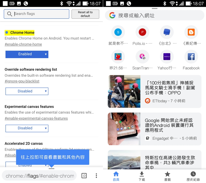 接下來示範怎麼將網址列移到最下方,先輸入「chrome://flags/#enable-chrome-home」,找到「Chrome Home」之後點 Enabled,這邊需要重新啟動兩次,第二次要進入應用程式將 Chrome 停用。