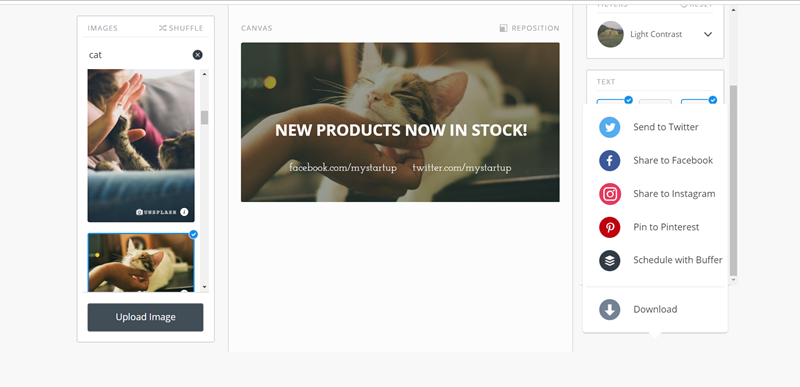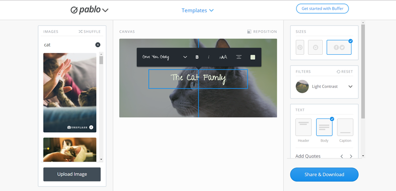 可以上傳自己的照片,或是輸入關鍵字搜尋圖片,身為貓奴阿湯就來用個貓咪,圖片來自免費圖庫 Unsplash 及 Pixabay,都是可再製及商用的,輸入文字後基本的字體樣式都能調整,可惜不支援中文。