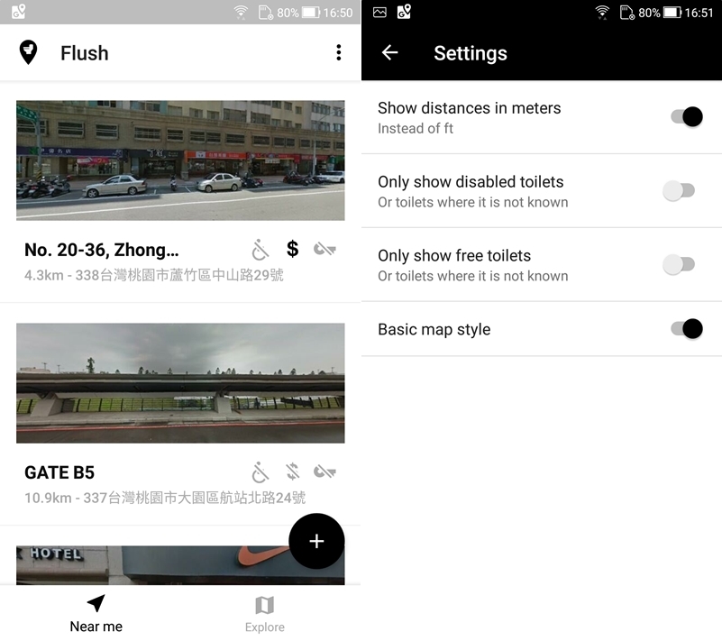 開啟 APP 定位後會顯示出附近的廁所位置,包括地址、距離與外觀,並以符號表示要不要費用、鑰匙以及有沒有無障礙空間,也能依需求再設定。