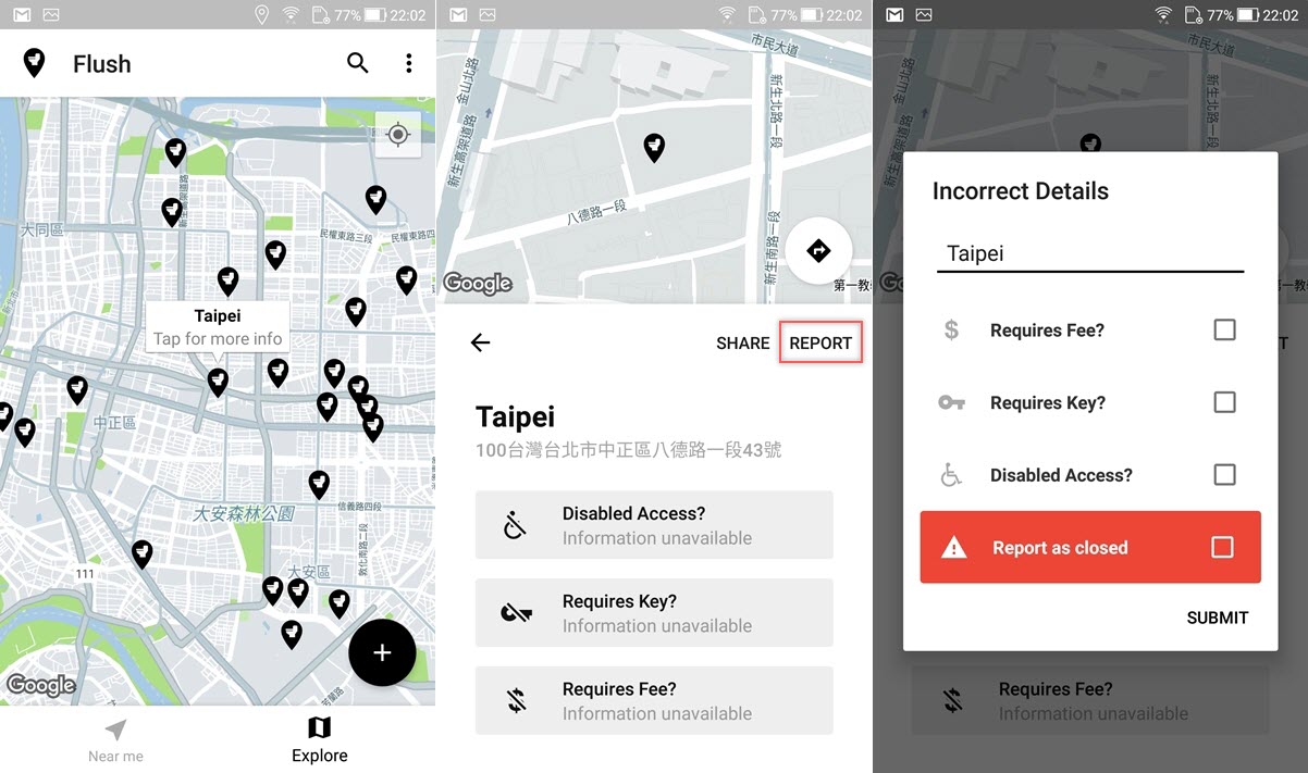 有的地點只有地圖跟地址,大家也可以協助系統修改及補充資訊,點 REPORT 後再選擇項目提交即可,包括停用了也可以回報。