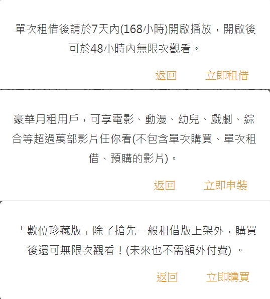 點按鈕下去會跳出說明,就這篇的主題來講,單次租借後要開啟的時限比前面兩個平台要短,反正是偶爾才有這個需求,決定後就馬上來看吧。