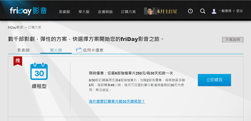 不過一些不定期的優惠可參考一下,像目前就是到 6/30 會再送兩部,單片館的部分除了續租型,部分影片也有幾十塊就能租借的方案,要點進去才知道。
