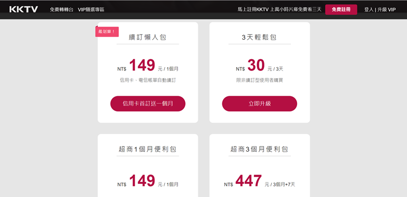 KKTV 可先購買 3 天 30 元,喜歡再升級,以租片性質來講一個月 149 也算可以接受,可使用信用卡、電信帳單續訂或超商付費。