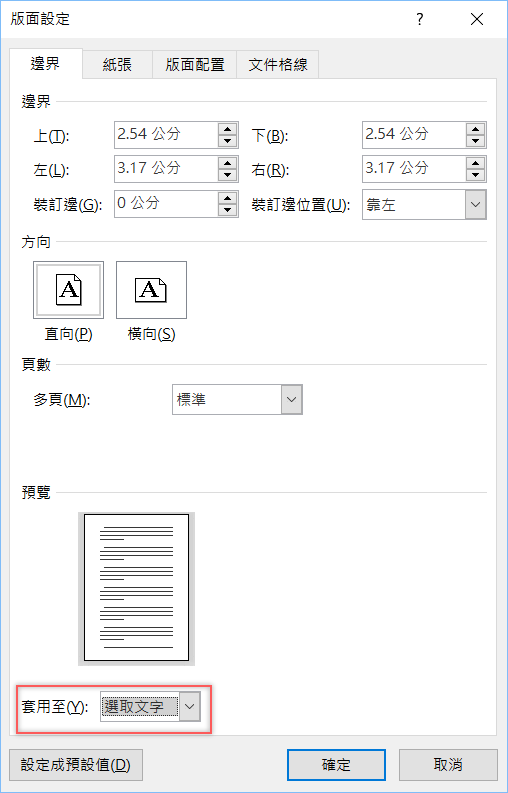 反白選取要更改版面的內容文字,再進入設定區改成套用至「選取文字」。