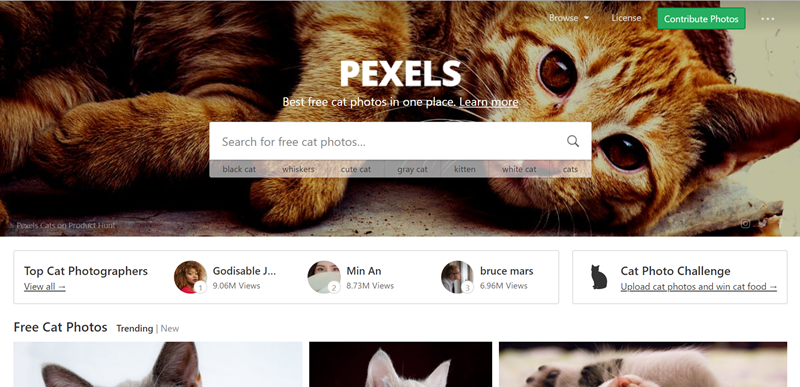 首頁可輸入或使用底下提供的七個常用關鍵字,包括 black cat、whiskers、cute cat 等,或選擇熱門的攝影師進入。