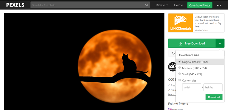 像這個月亮背景的貓剪影,有說明是 CC0 授權不須提供歸因,底下還有相關圖片、標籤、像素、拍攝時間、色票,以及使用相機和焦距、感光度等,蠻詳細的。
