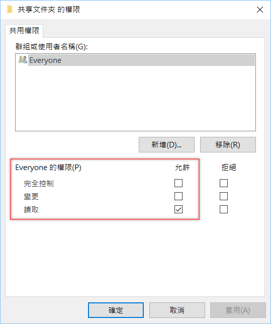 選擇群組,如果沒有特別建立過預設會是 Everyone,再勾選允許的權限即可。