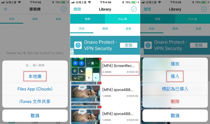 接著下載一款具有 MP3 轉檔功能的 APP,阿湯使用的是「iConv」,開啟後點左上角的+選擇本地庫的影片,將它導入到 APP。