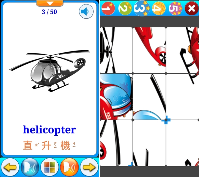 認識交通工具並藉由拼圖加深印象,提供中英文名稱和發音,果然現在小孩子都是雙語教育了,圖文對照學起來也更快。