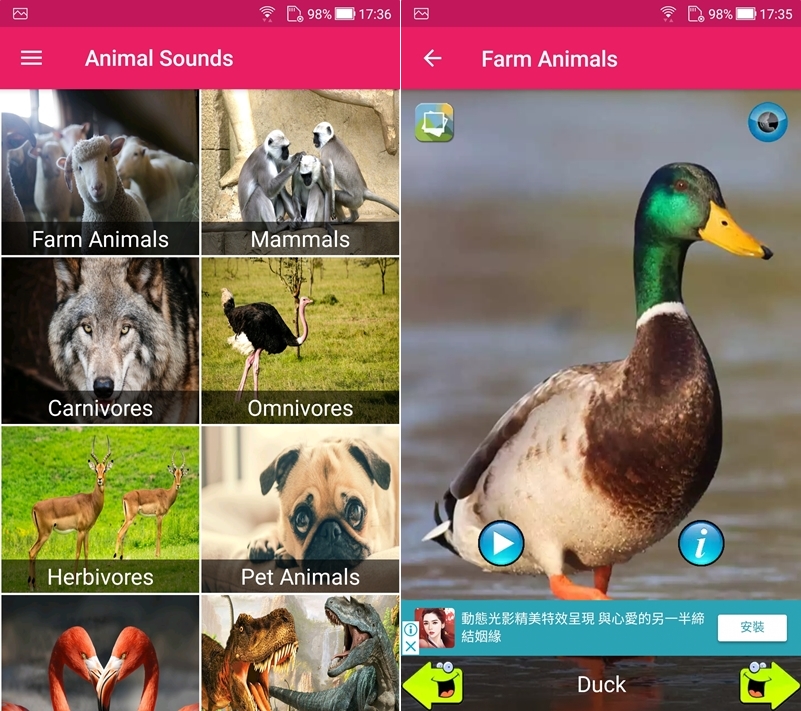 認識動物的聲音,除了提供各個種類的動物,還有恐龍及寵物類,阿湯覺得照片都選得很清楚又可愛,因為這款沒有 iOS 版本,所以阿湯另找一款相似的 APP 連結。
