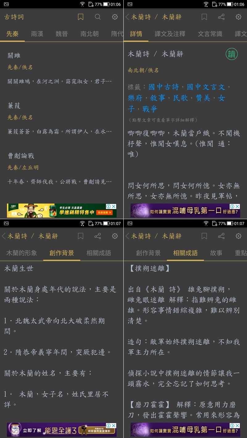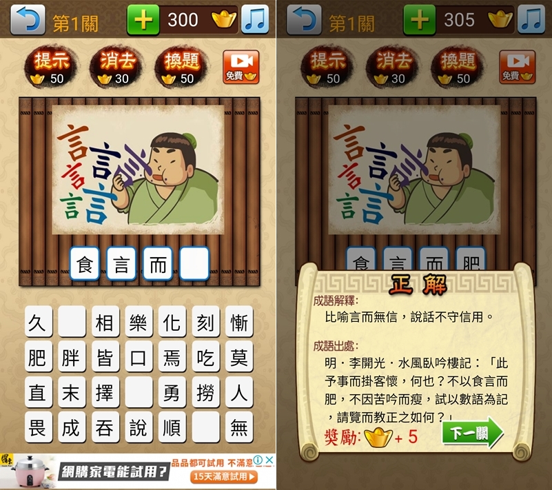 使用方式跟上一款差不多,都是從底下點字後填進去,解釋跟出處也都會提供,可惜很多細節顯示的是簡體字,拼音也不是注音。