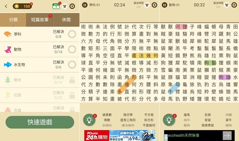 這類遊戲阿湯雖然歸為國小以上,但應該算是全年齡適用,以前沒接觸過後來才知道在上班族之間很紅,在中間那一堆字中找出下面列的詞,並用手指劃過去,是訓練眼力的好幫手,還能計時比速度,挺好玩的。