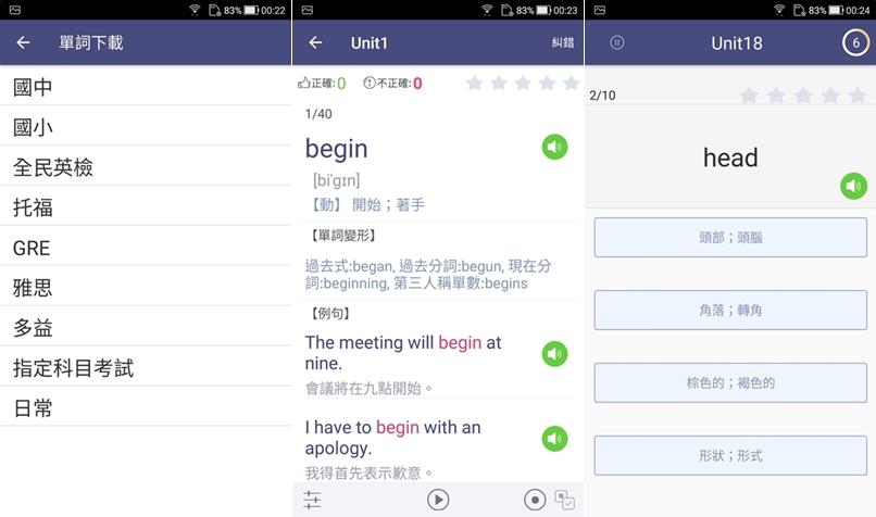 這款介面配置得不錯挺好上手,範圍簡單分為升學跟就業,有聽發音選字、看單字選解釋等題型,版面設計也很美觀,阿湯沒事應該會來玩拚就業那一塊。
