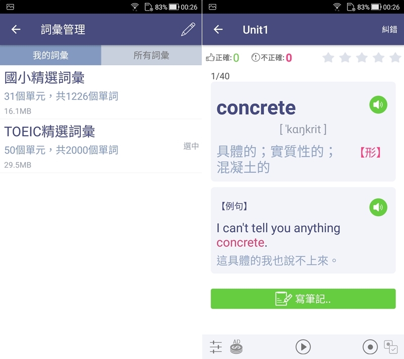 標榜指考適用的必備詞彙,分上下兩部分,可自訂學習範圍與等級,並由測驗驗收成果,單詞與例句都有真人發音,也可以錄下自己的發音來對照。