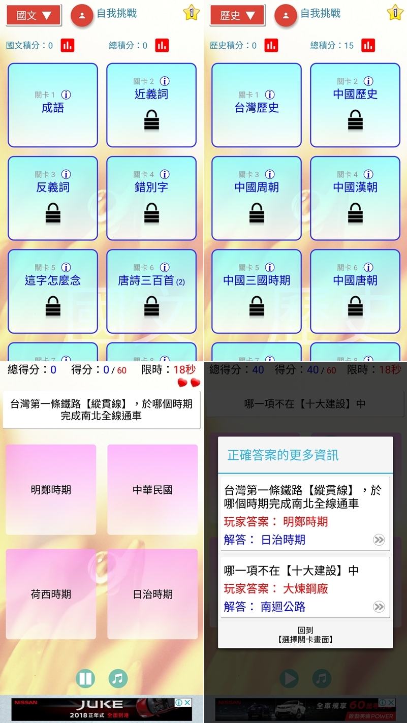 以教科書來說大概是國中範圍,但一般人當作增長知識也可以,因為很多小時候學的阿湯也忘記了...以限時挑戰的方式一關一關測驗,過關後再解鎖下面關卡,每科答案也都會有詳解。