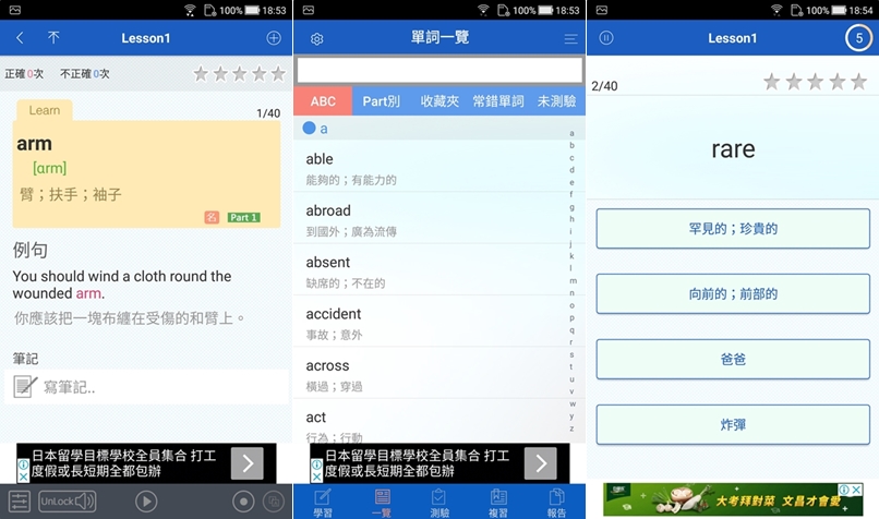 精選國中必背英文單字 1770 個,並依課程循序漸進教學,還有測驗可快速檢測學習效果,單字當然也是可以自行依需求分類。