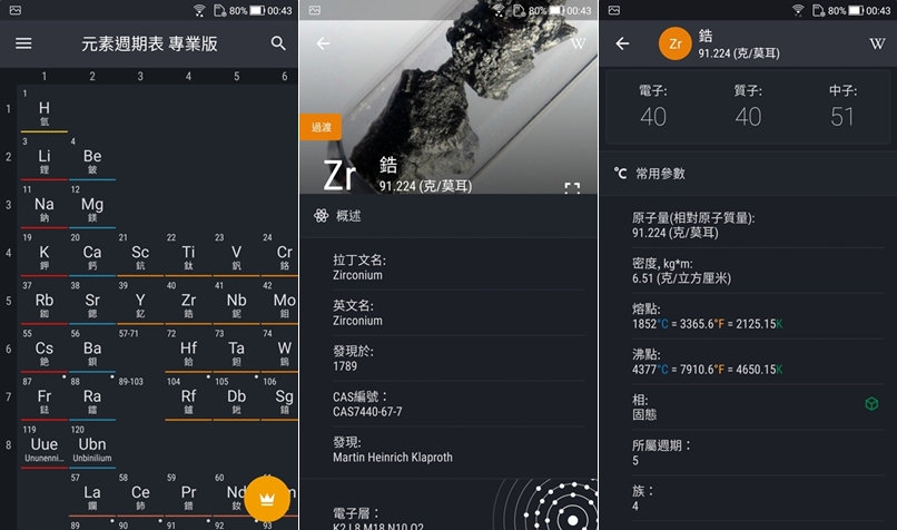 如果說上一款比較適合國中生背元素表輔助用,這一款就是進階認識各種元素,包括發現年代、編號、發現者、密度、熔點沸點等詳細資料都有,搭配圖片的設計也蠻好看的,除了作為課外補充,有興趣多了解的朋友也能查詢。