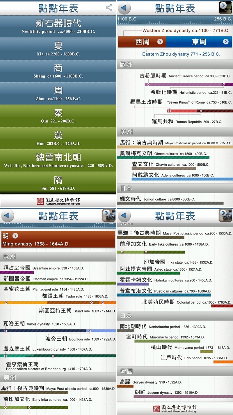 國立歷史博物館出的年表系列,以時間線的方式對照,除了中國還有歐洲、美洲、日本、韓國相對照,感覺是國中以上各級考試都很需要,不同顏色並加上數字一起顯示真的清楚多了。