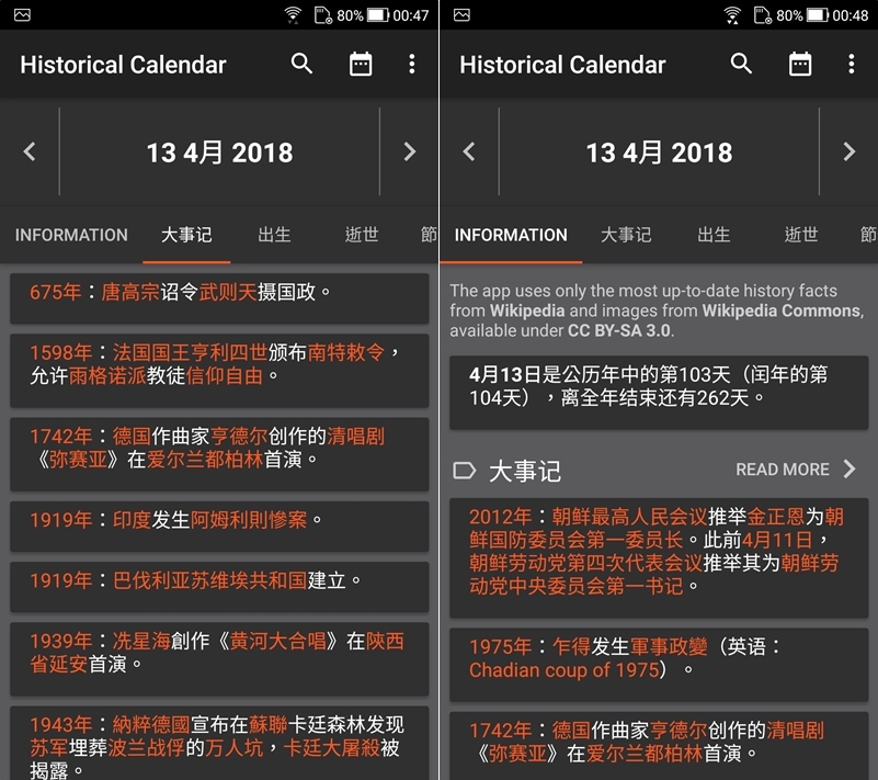 以維基資料為基礎詳列每個日期的大事記、出生和逝世者、節目等等,並可離線使用,可阿湯明明選繁體中文但顯示出還是簡體,有待加強啊。