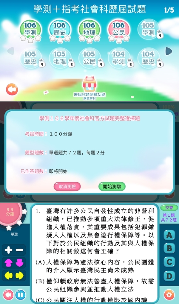 收集考大學需要的學測與指考歷屆資訊,內含最新更新的各科試題,並以線上測驗的方式計時做題,可以先試用覺得不錯再購買解鎖。