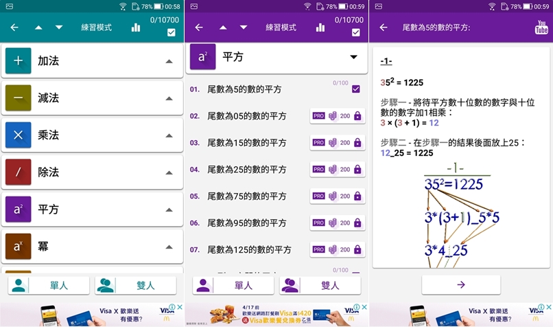 不過轉到練習模式阿湯就有點傻眼,因為這些技巧都沒看過,不知道現在學校老師會教這樣嗎?還是 APP 與補習班老師才會提到的計算方式,以平方來說,下面這樣算真的快很多但也是需要練習吧。