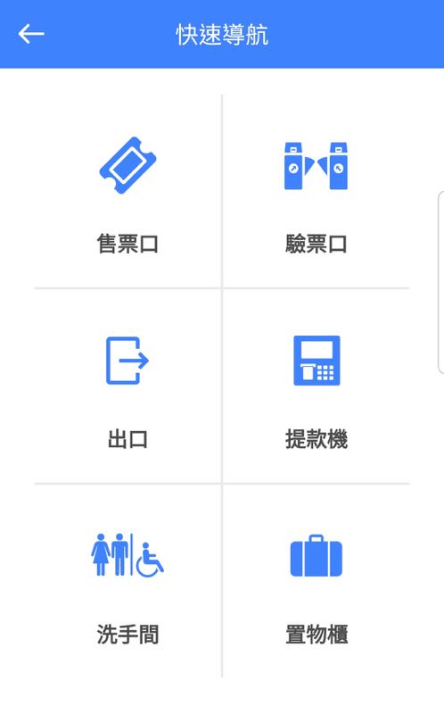 - 「快速導航」- 還能進階挑選「售票口」、「驗票口」、「出口」、「提款機」、「洗手間」與「置物櫃」這六項常用的找尋標的,甚至連「洗手間」還相當貼心的依照不同使用者需求設計「親子廁所」和「無障礙廁所」的選項。