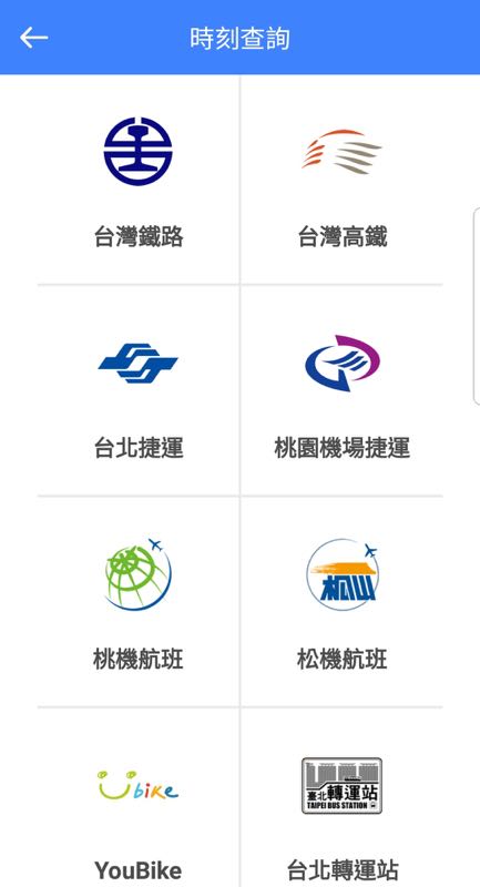 - 「時刻查詢」 - 包括了「台灣鐵路」、「台灣高鐵」、「台北捷運」、「桃園機場捷運」、「桃機航班」、「松機航班」與「YouBike」和「台北轉運站」的交通時刻資訊。