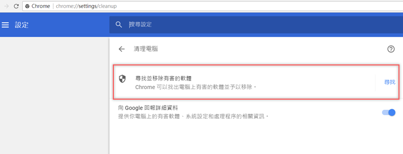 打開 Chrome,複製下面這段貼到你的網址列:chrome://settings/cleanup然後會進入下面這個頁面,點尋找。