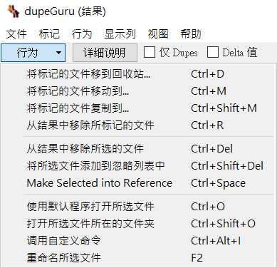 點開行為選單,底下是關於標記文件的處理,包括刪除、移動、複製、開啟或重命名,也有快速鍵,可依需求進入。
