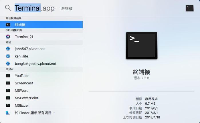 先使用右上角的放大鏡,搜尋「Terminal」按 Enter 開啟。