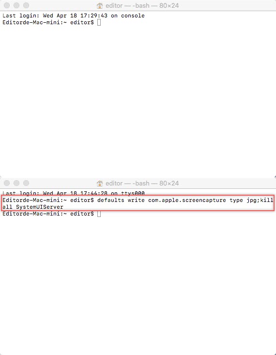 defaults write com.apple.screencapture type jpg;killall SystemUIServer